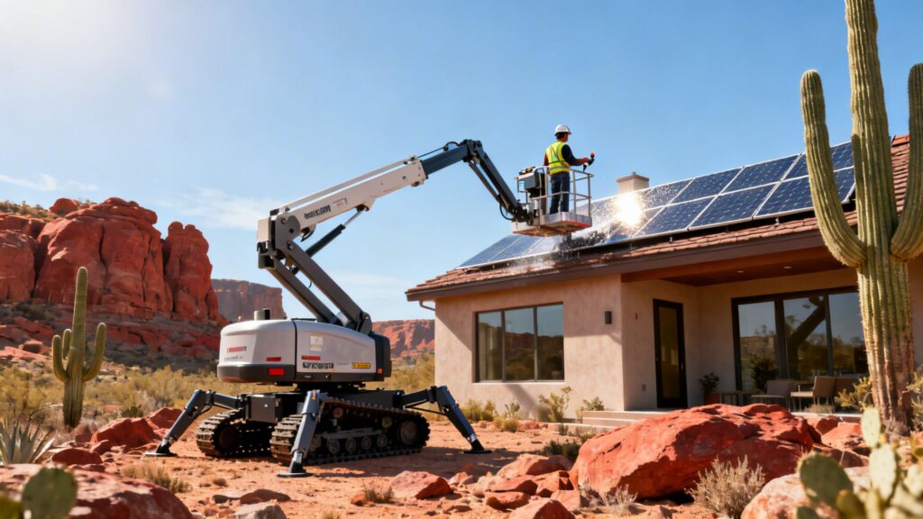 Here in dusty Arizona, keeping solar panels clean is key to getting the power you're paying for. A spider lift is the perfect tool for the job because it lets a technician work on panels on steep or tall roofs without ever touching them. Putting weight on a panel is a great way to cause micro-cracks and kill its efficiency.
